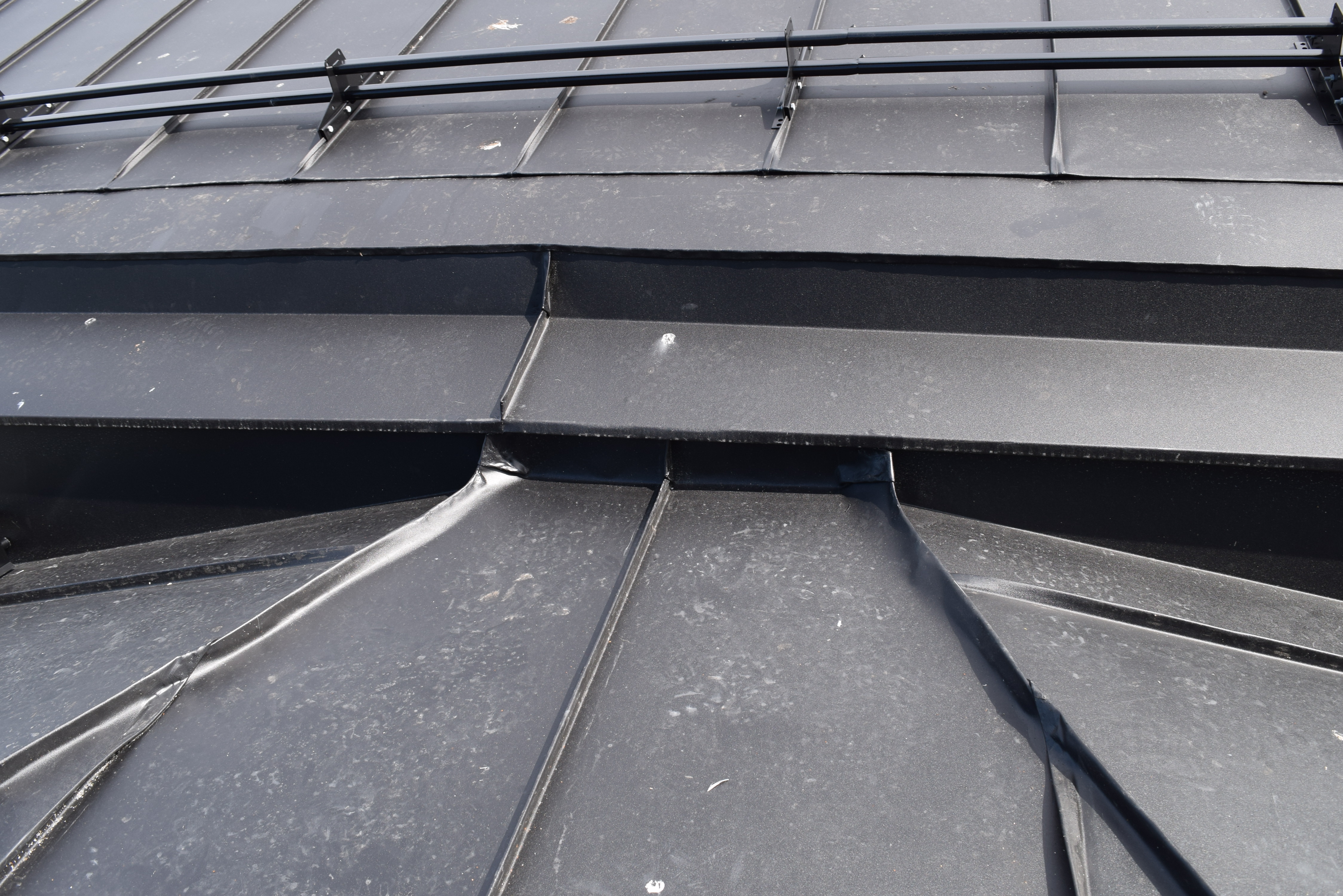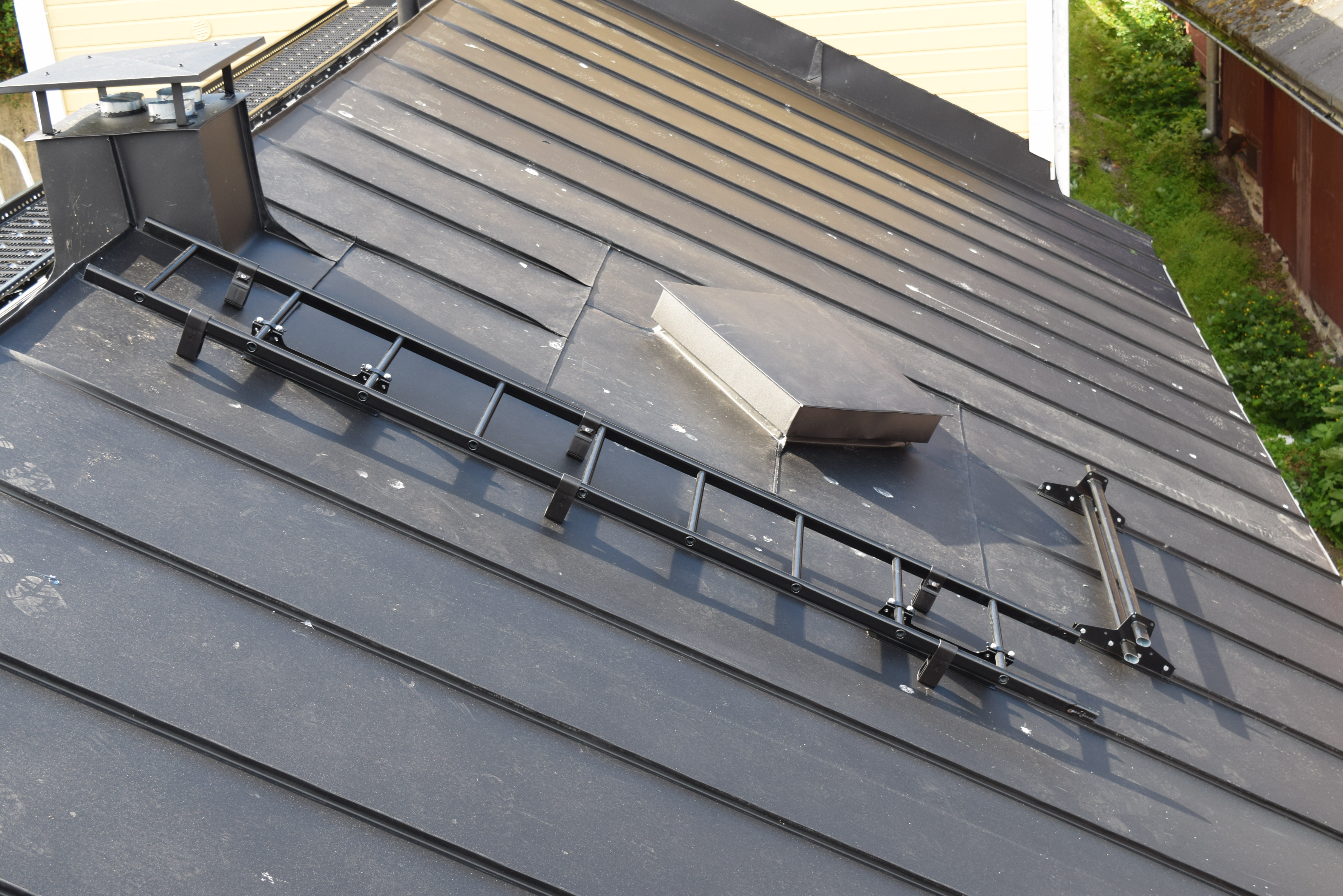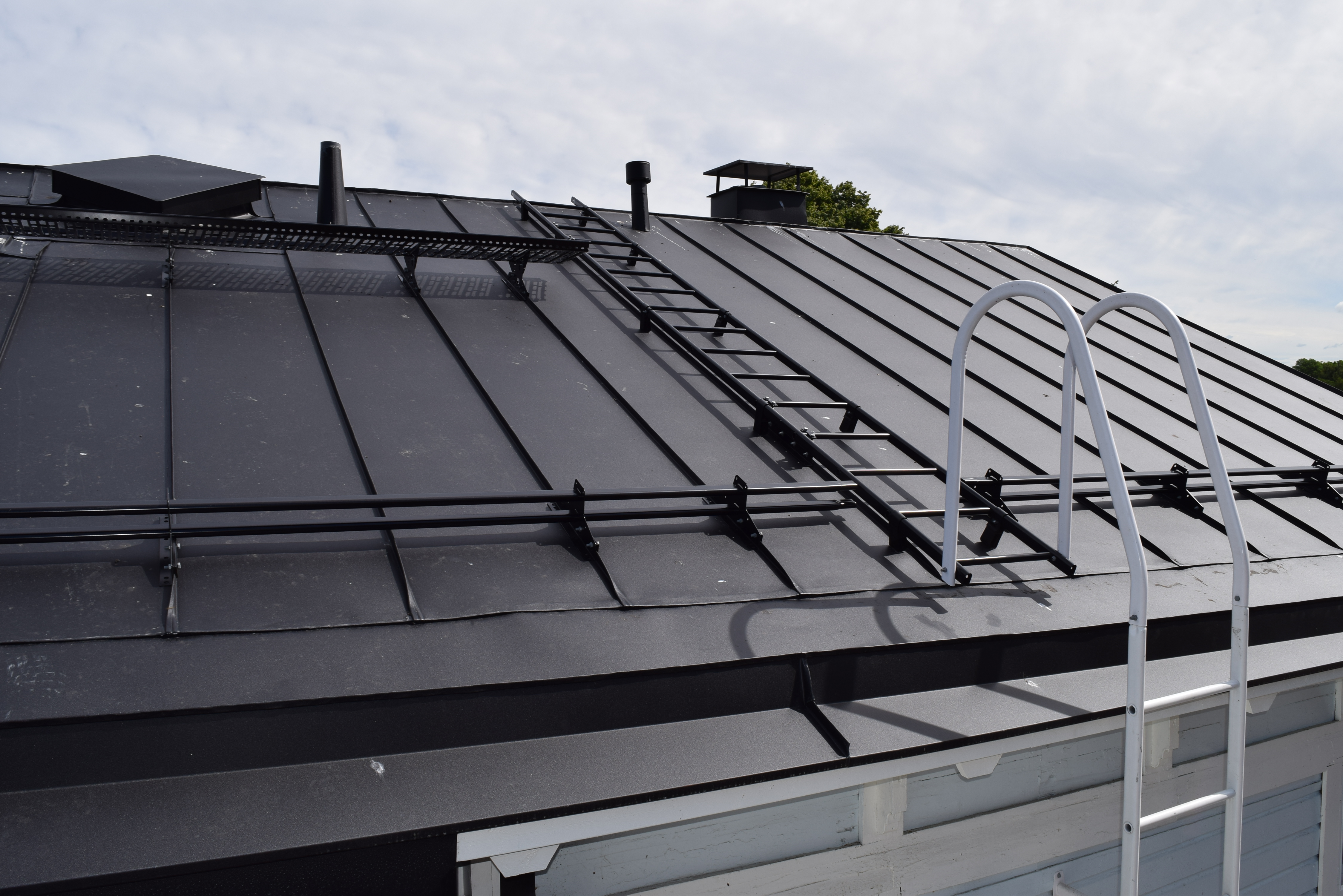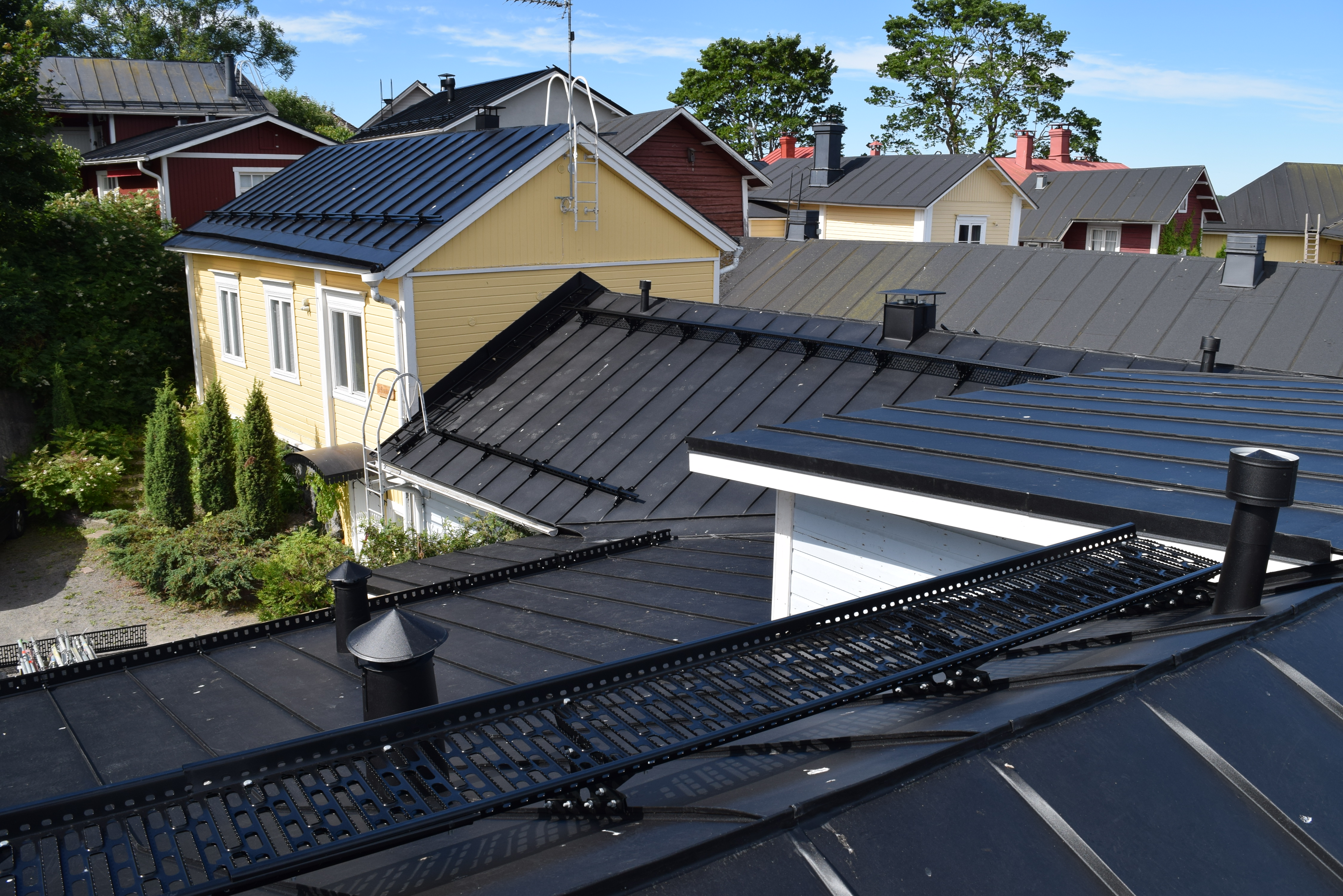 Työn sisältö: Vanhan konesaumakaton purku, yläpohjan villojen vaihto, kattotuolien päiden korjaus, ruodelaudoitus, aluskatteen asennus, konesaumakaton asennus, kattoturvatuotteiden asennus sekä pienrakennusten kattojen maalaus.