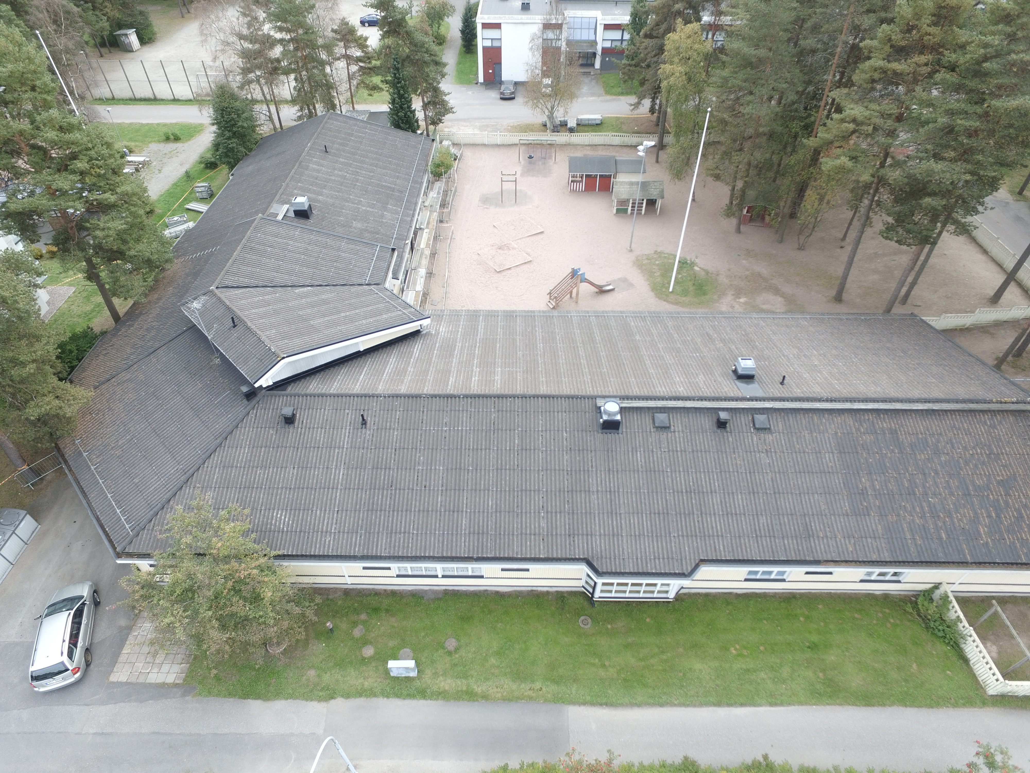 Työn sisältö: Vanhan minerit katon purku, alustan vanerointi, aluskatteen asennus, konesaumakaton asennus sekä kattoturvatuotteiden ja sadevesijärjestelmän asennus