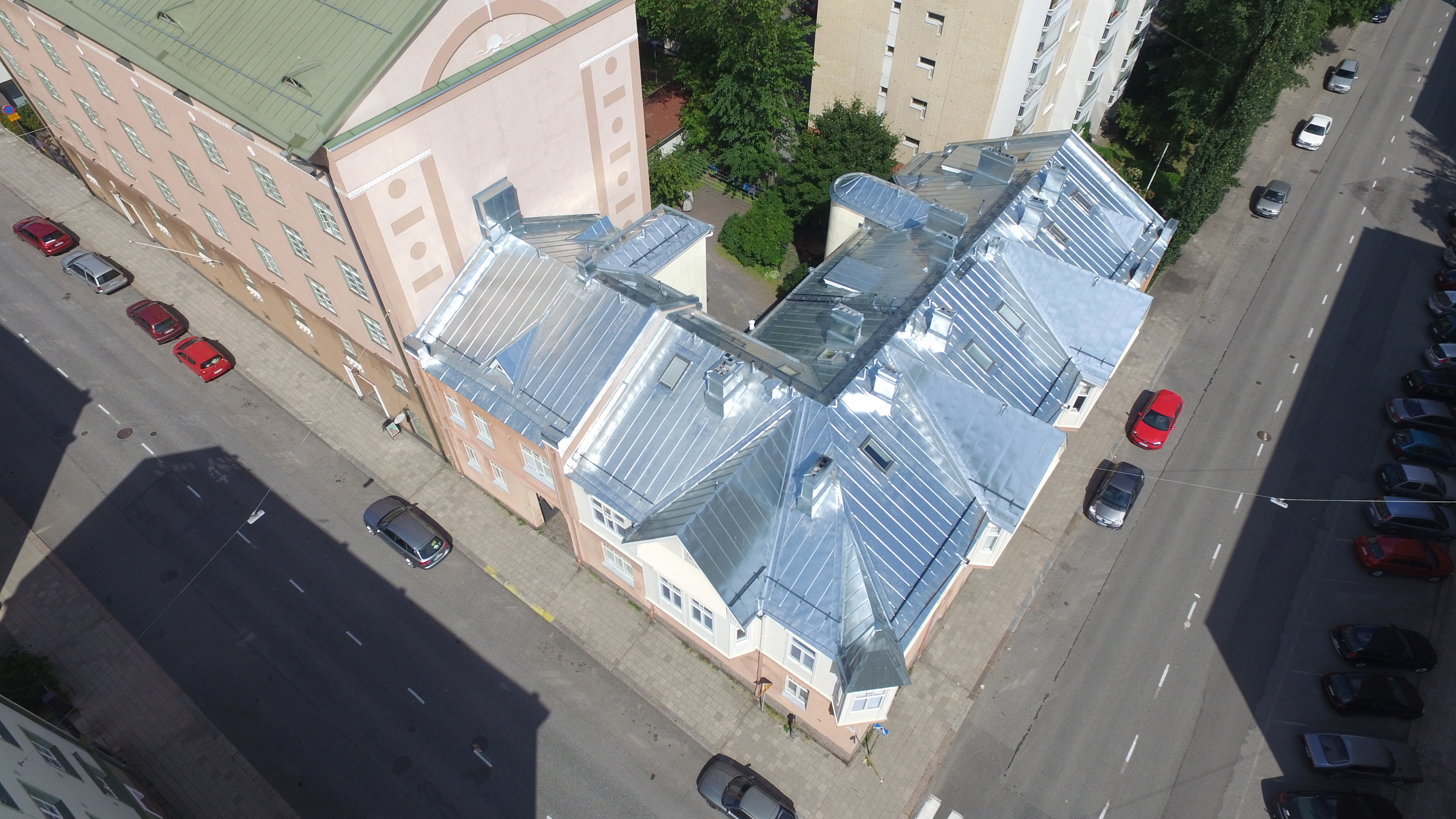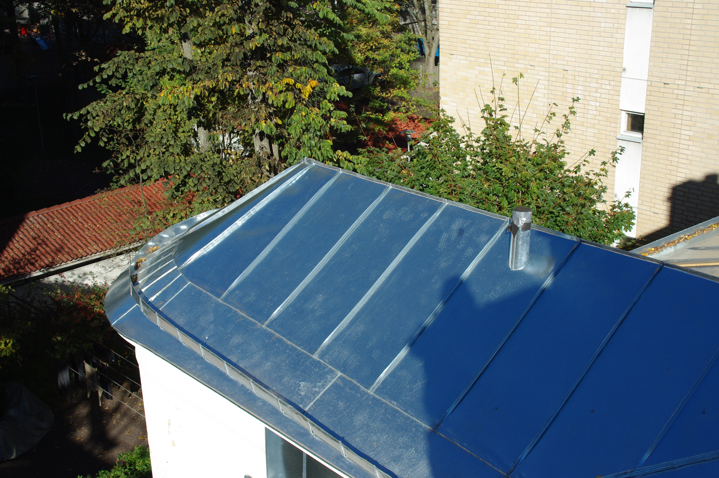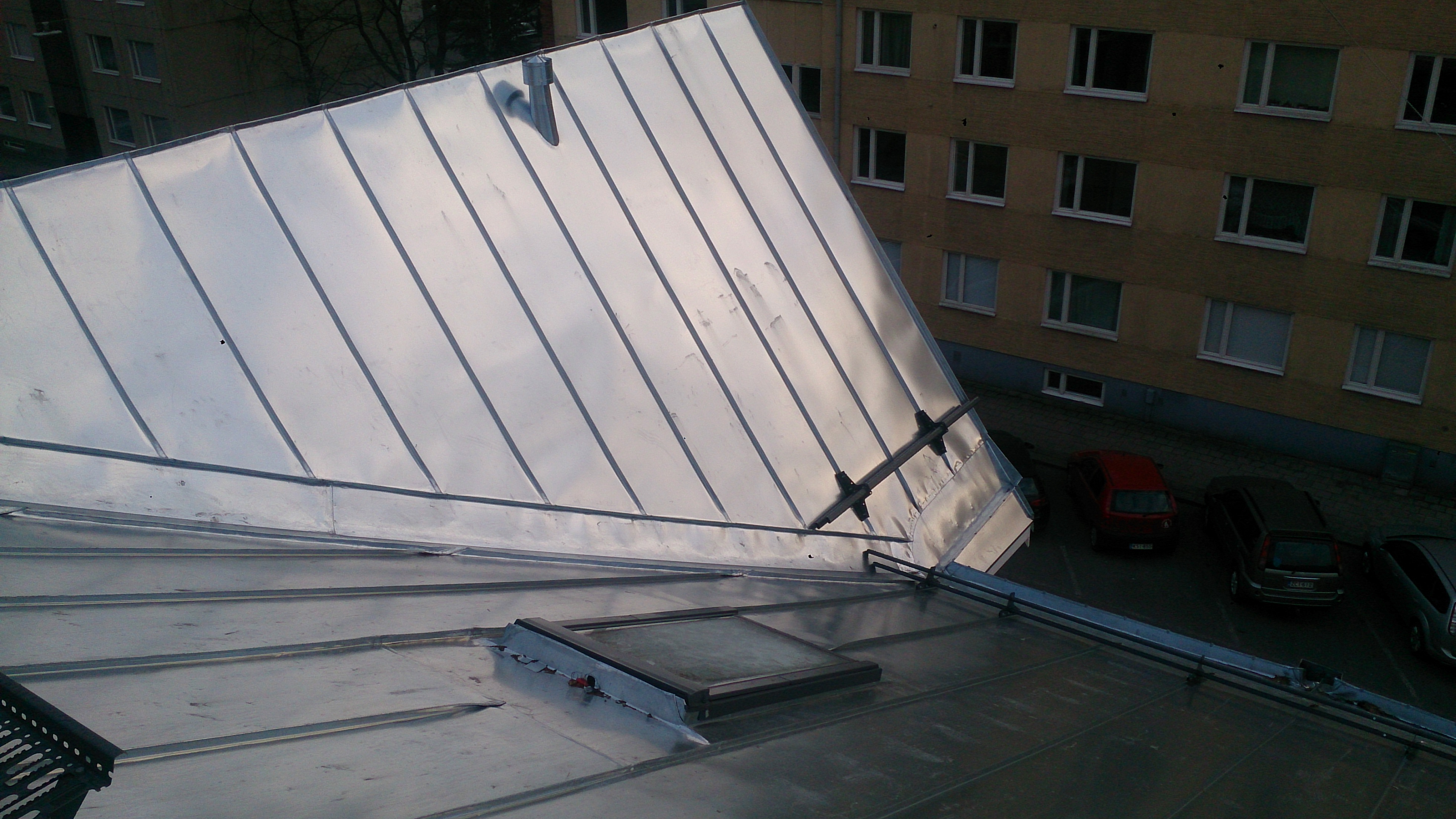 Työn sisältö: Vanhan konesaumakaton purku, ruodelaudoitus, aluskatteen asennus, konesaumakaton asennus sekä kattoturvatuotteiden asennus