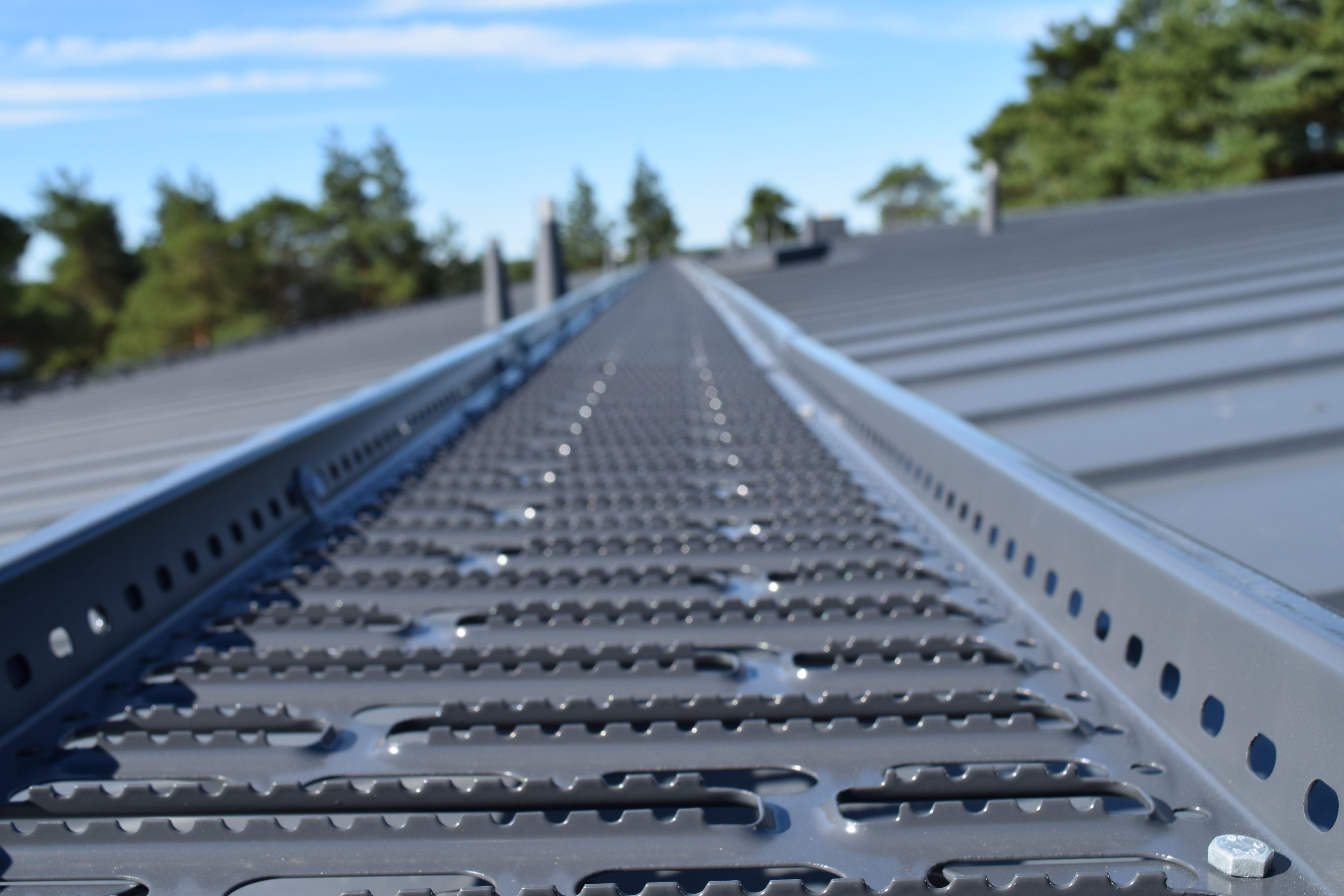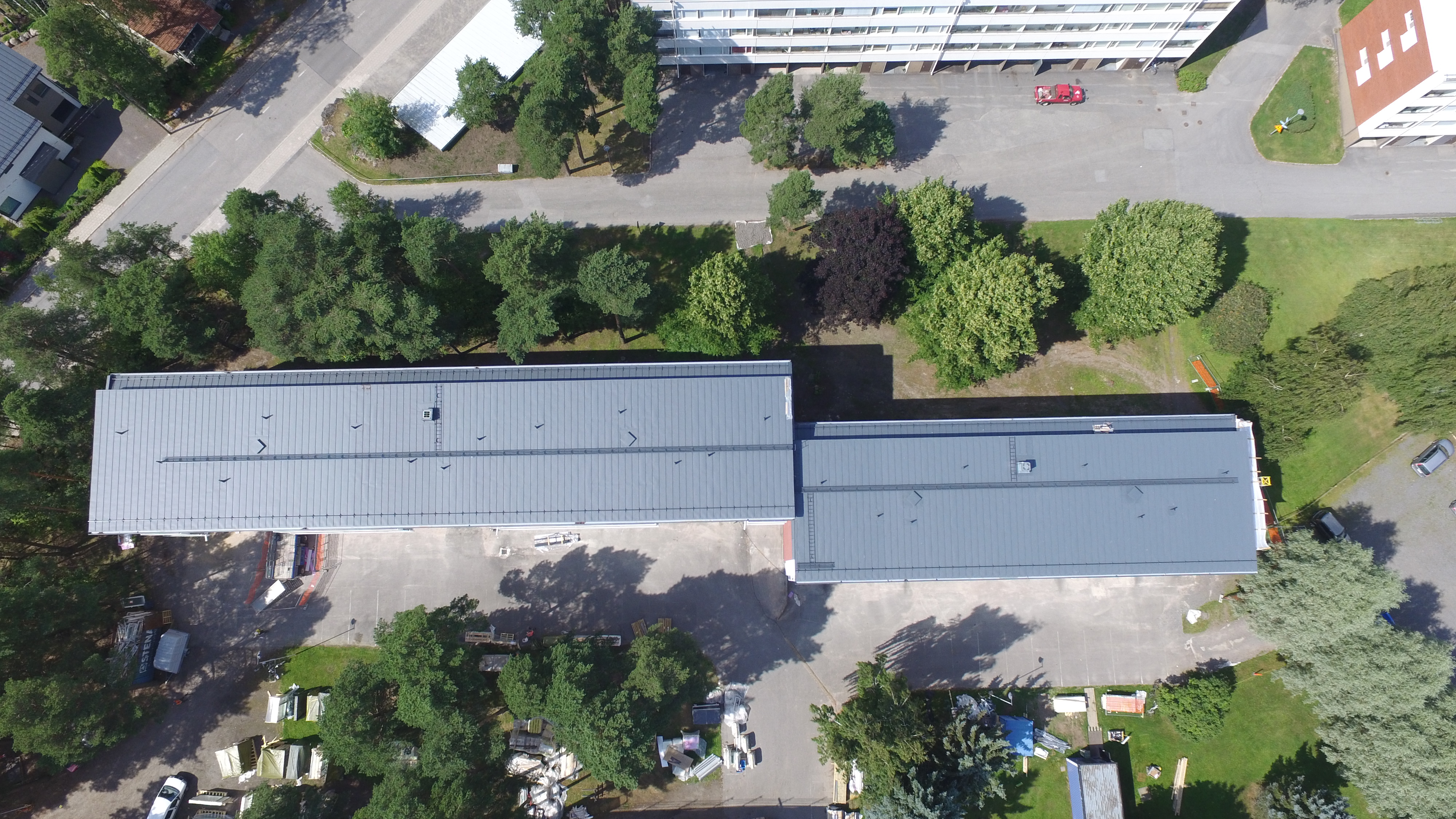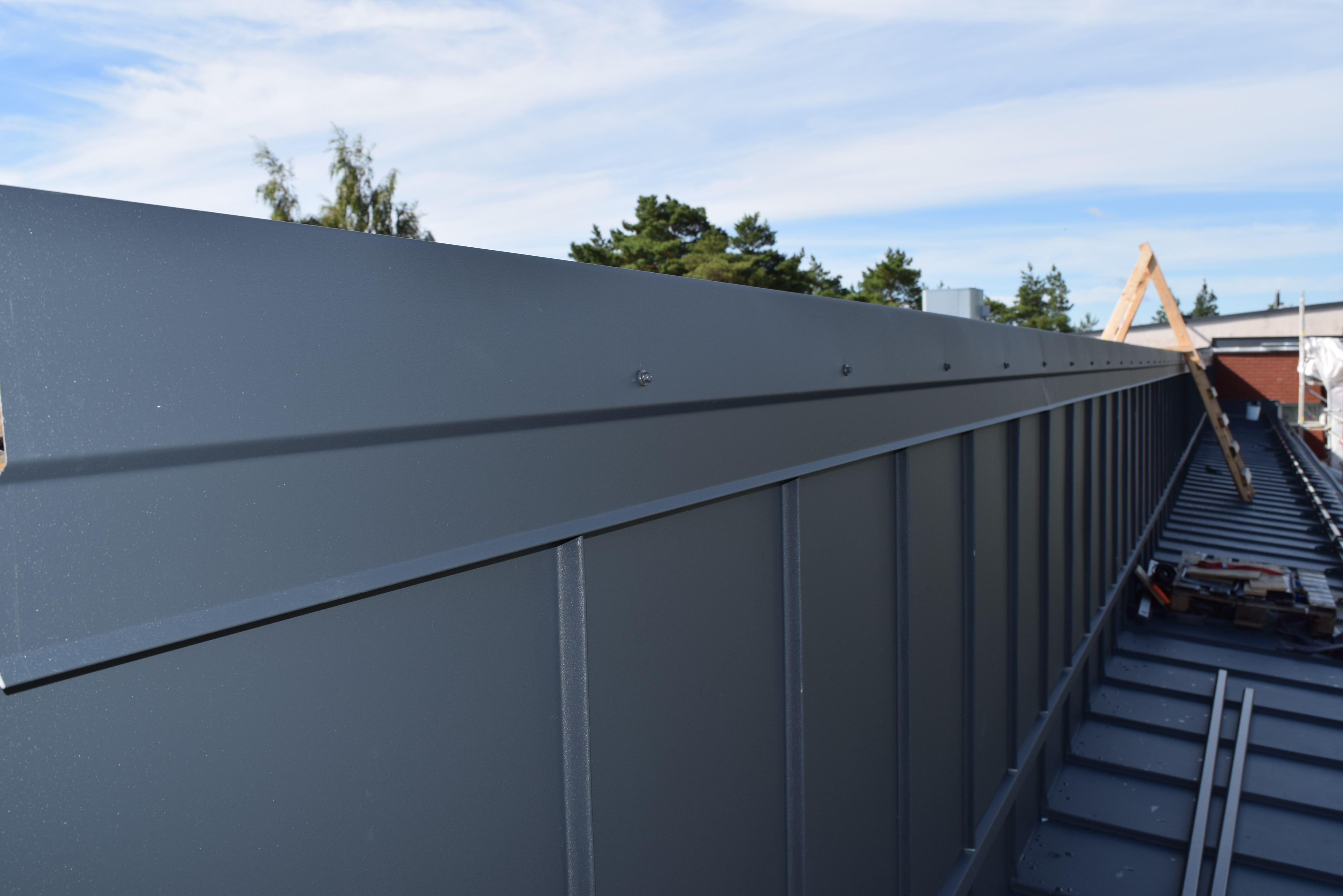 Työn sisältö: Vanhan konesaumakaton purku, kattotuolien jatko, ruoteiden uudelleen naulaus, aluskatteen asennus, konesaumakaton asennus, kattoturvatuotteiden asennus.