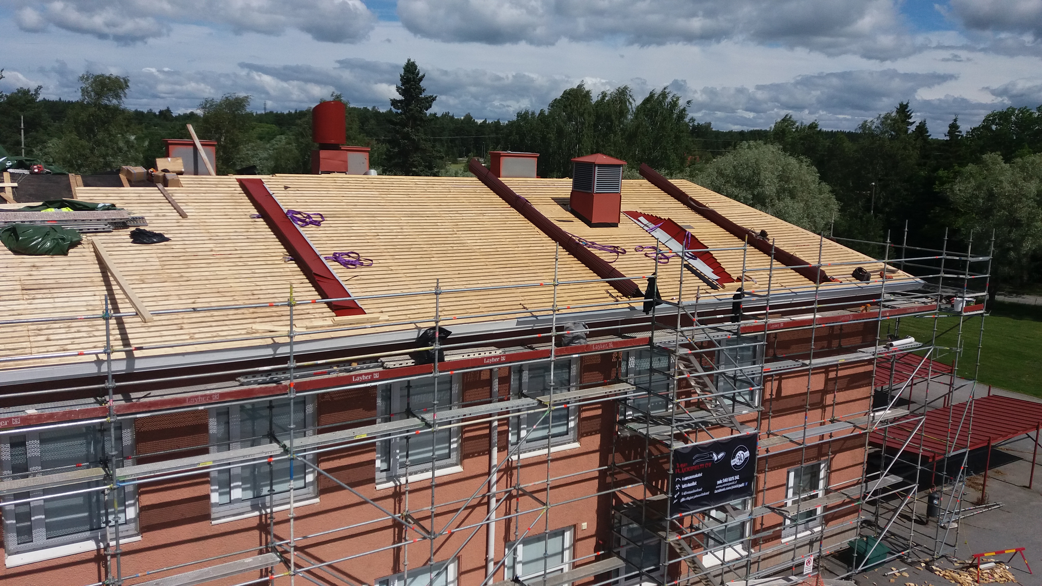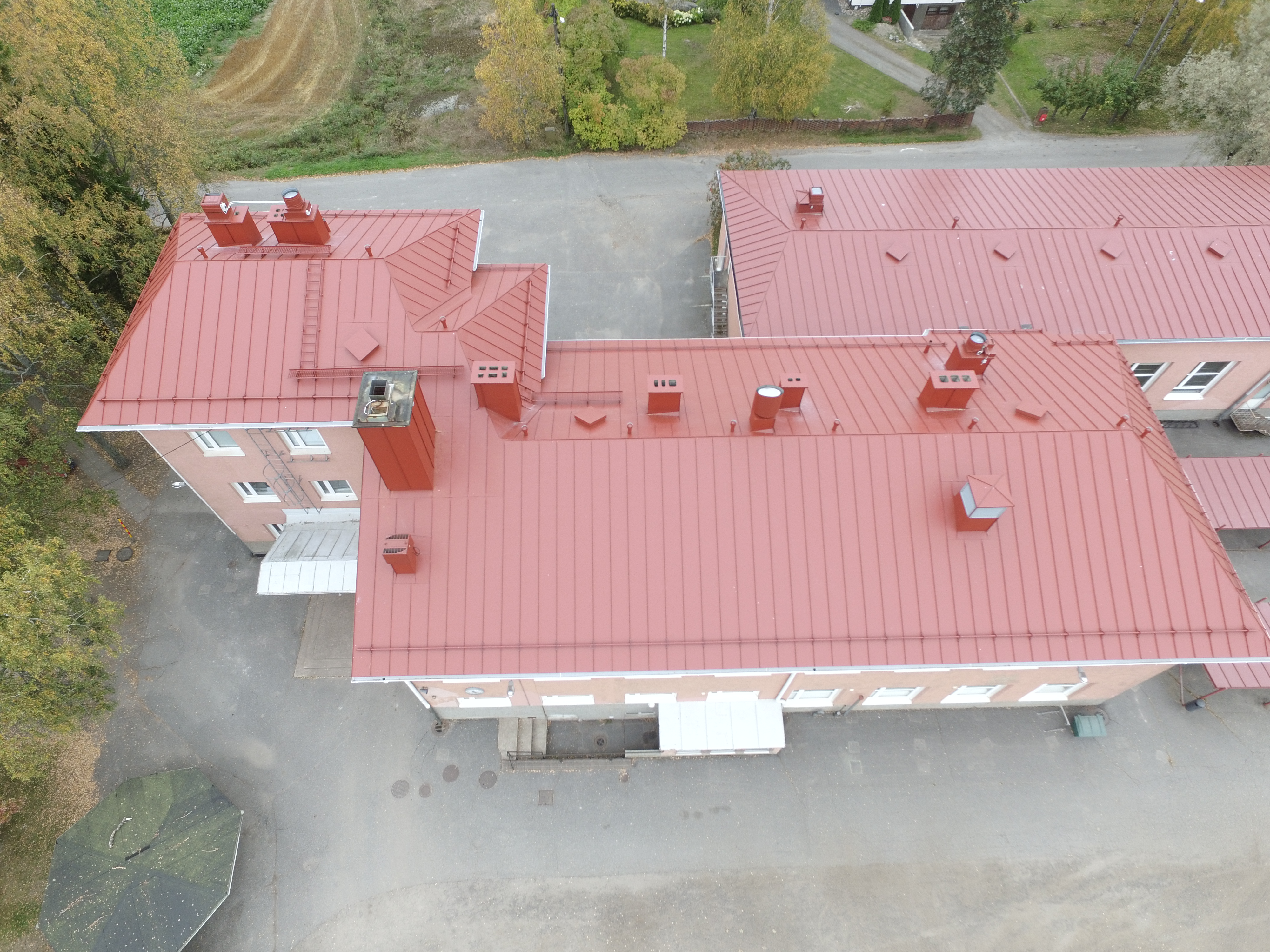 Työn sisältö: Vanhan minerit katon purku, aluskatteen asennus, katon korotus, ruodelaudoitus, otsalautojen asennus, konesaumakaton asennus sekä kattoturvatuotteiden asennus