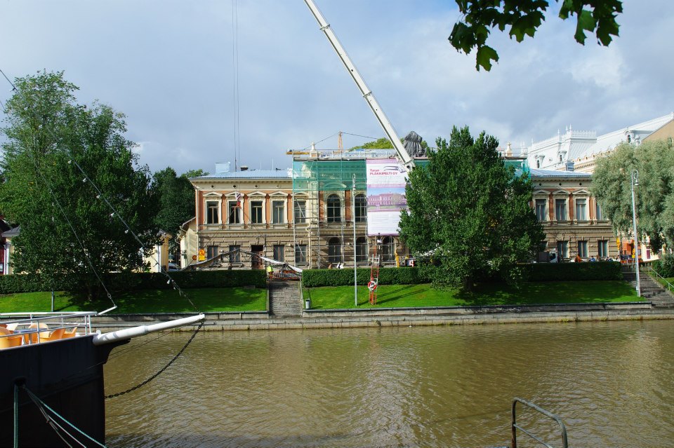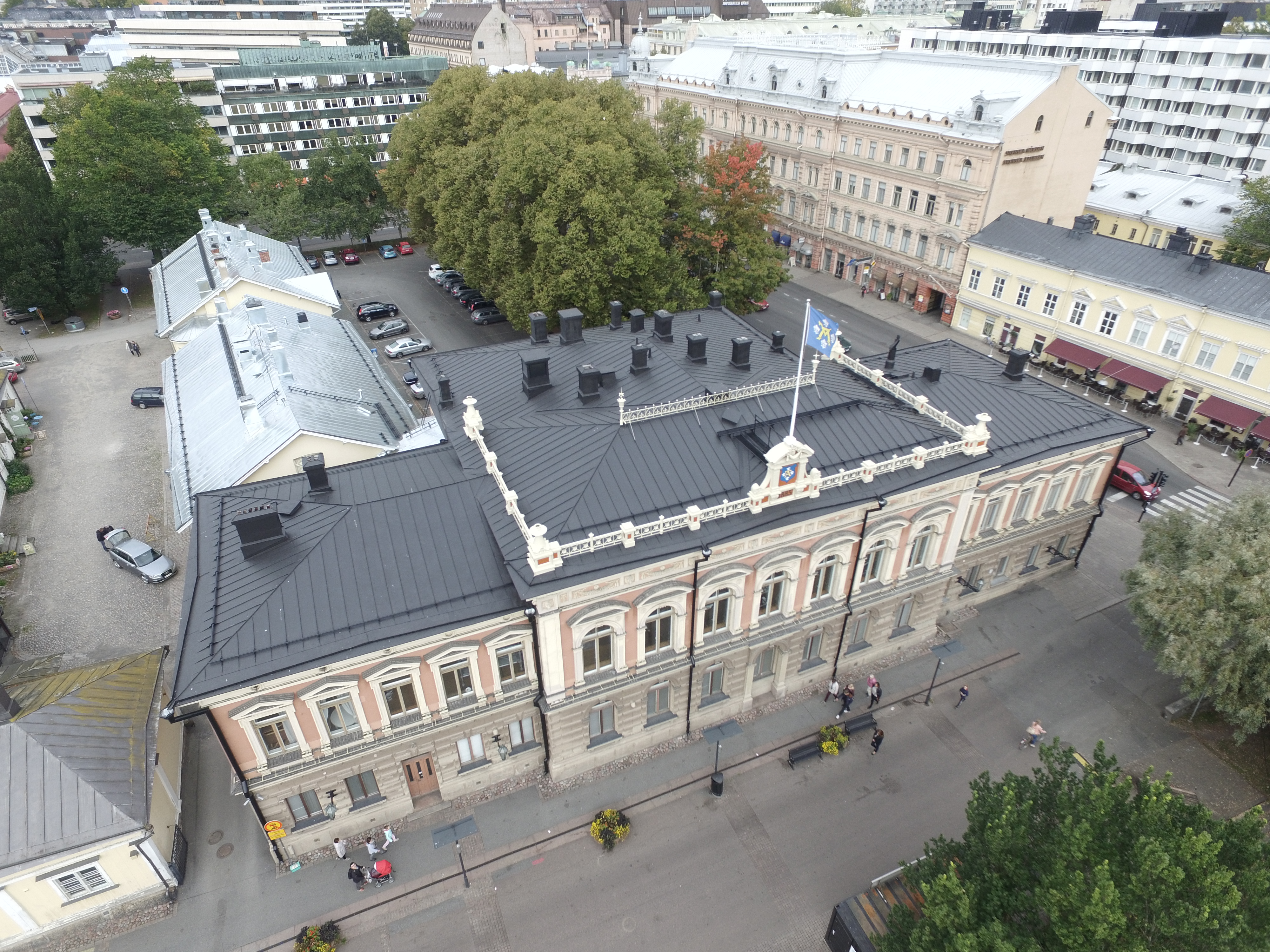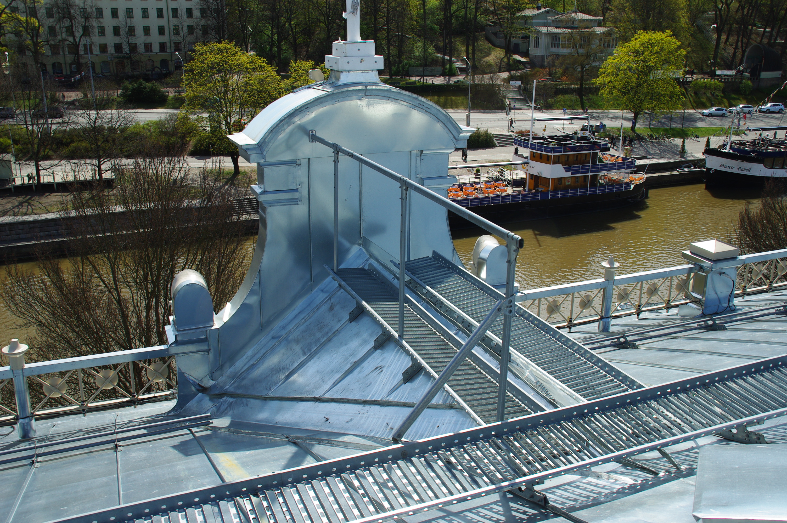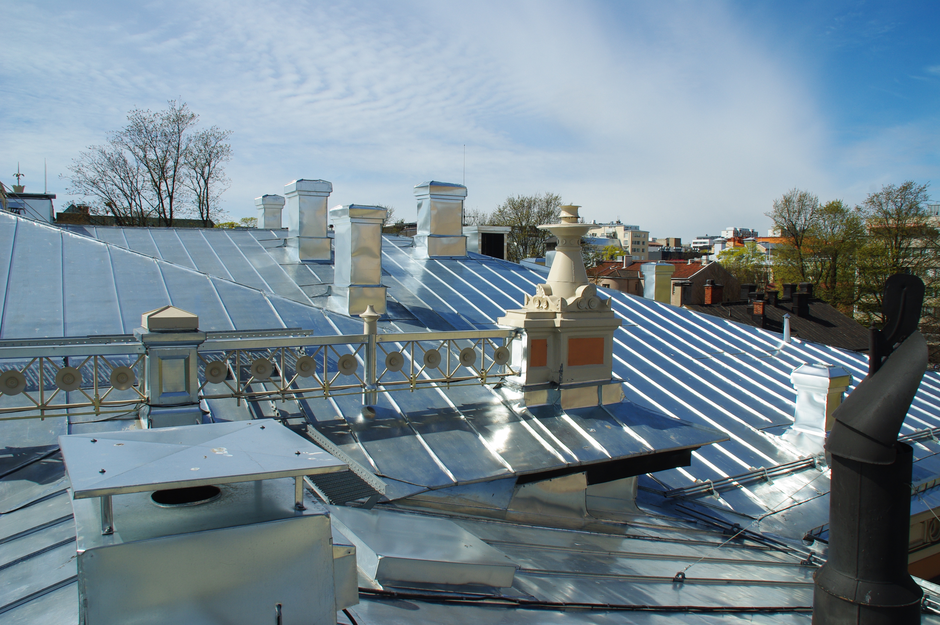 Työn sisältö: Vanhan konesaumakaton purku, ruoteiden uudelleen naulaus, räystäiden korjaus,aluskatteen asennus, konesaumakaton asennus, kattoturvatuotteiden asennus sekä koristeiden entisöinti